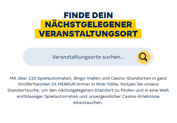 Vielfältige MERKUR‑Standorte in ganz Deutschland: MERKUR Deutschland betreibt mehrere Hundert Spielhallen, die sich durch moderne Ausstattung, großzügige Raumkonzepte und geschultes Personal auszeichnen. Jeder Standort ist so gestaltet, dass er sowohl Unterhaltung als auch Sicherheit bietet: helle, offene Räume, ergonomisch angeordnete Spielbereiche und ausgewiesene Ruhe‑Zonen schaffen eine angenehme Umgebung für verantwortungsvolles Spielen.